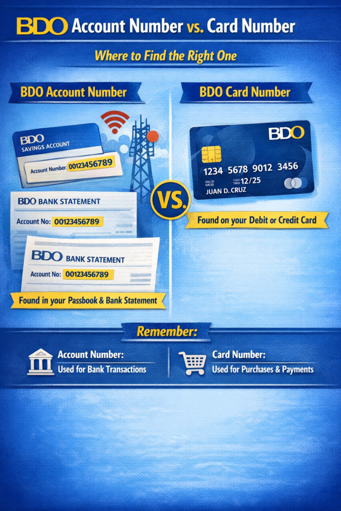 The primary difference is that your BDO Account Number is a 12-digit code used for receiving funds, while your BDO Card Number is a 16-digit code used for spending.