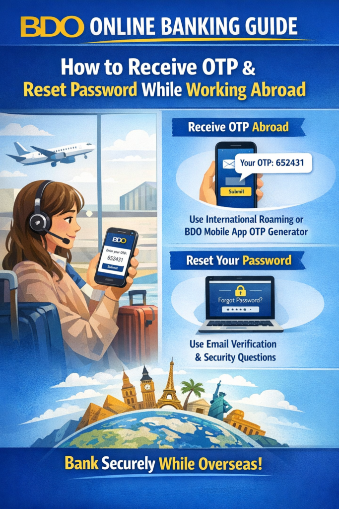 Managing your BDO account from abroad is possible, but receiving One-Time Passwords (OTPs) and resetting passwords requires specific setups.